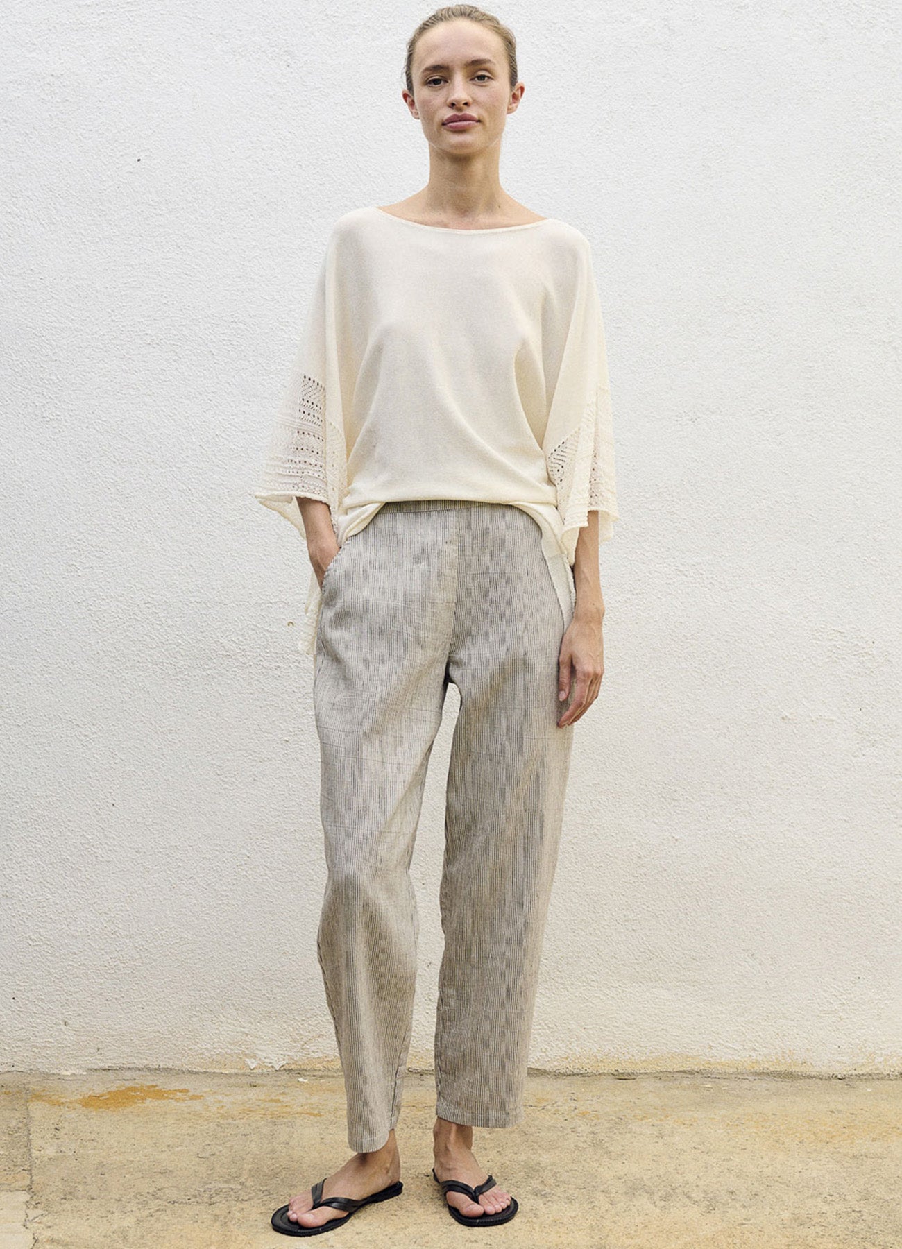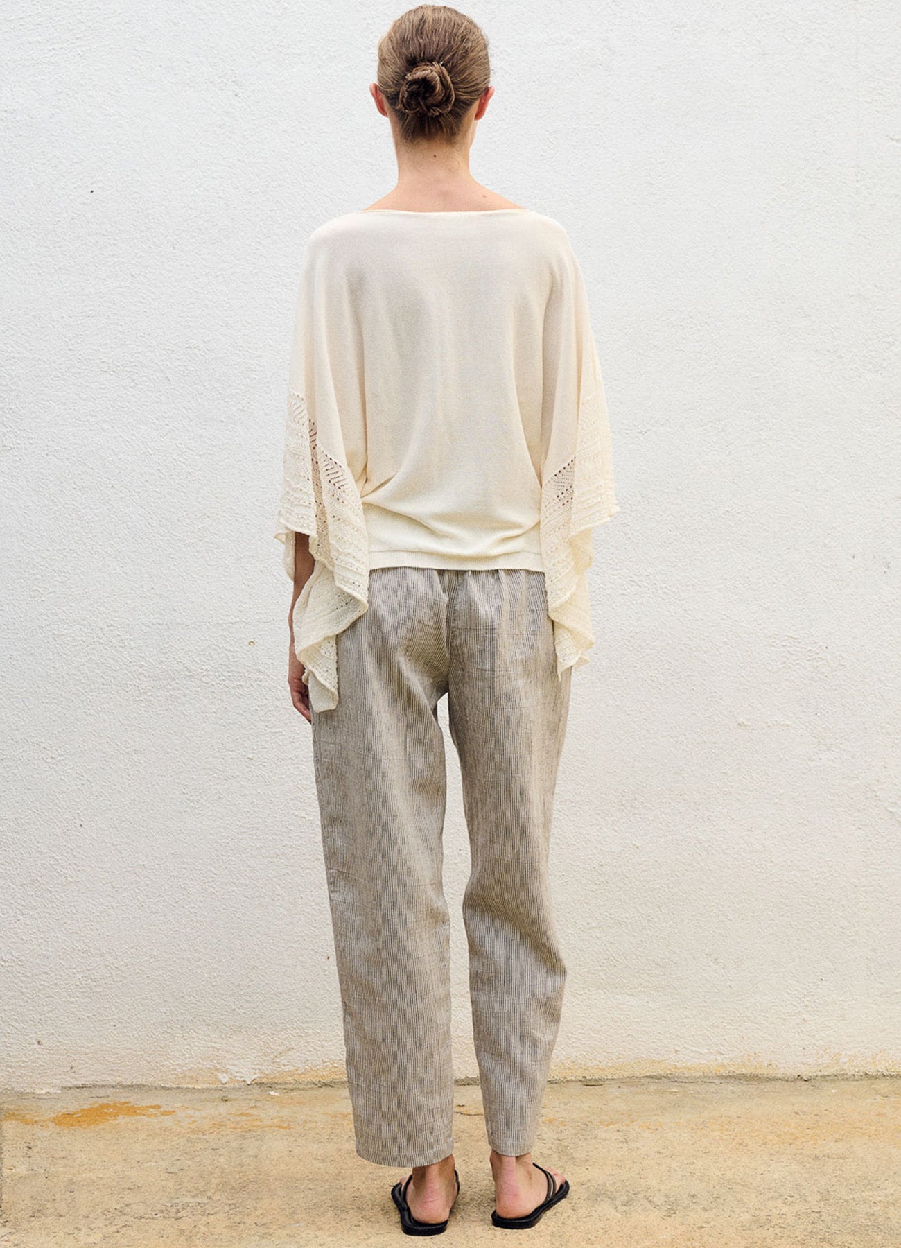 This knit top is defined by its relaxed drape and subtle elegance. Featuring a wide boat neckline and flowing sleeves with delicate openwork accents, it combines comfort with refined detail. An easy piece to style, it brings a touch of sophistication to everyday looks.