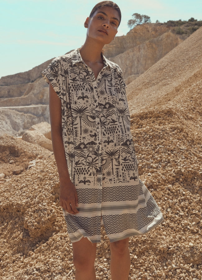 This sleeveless midi shirt dress features a classic shirt-style collar and an all-over printed design for a fresh, modern look. The button-front closure combines practicality with effortless style.