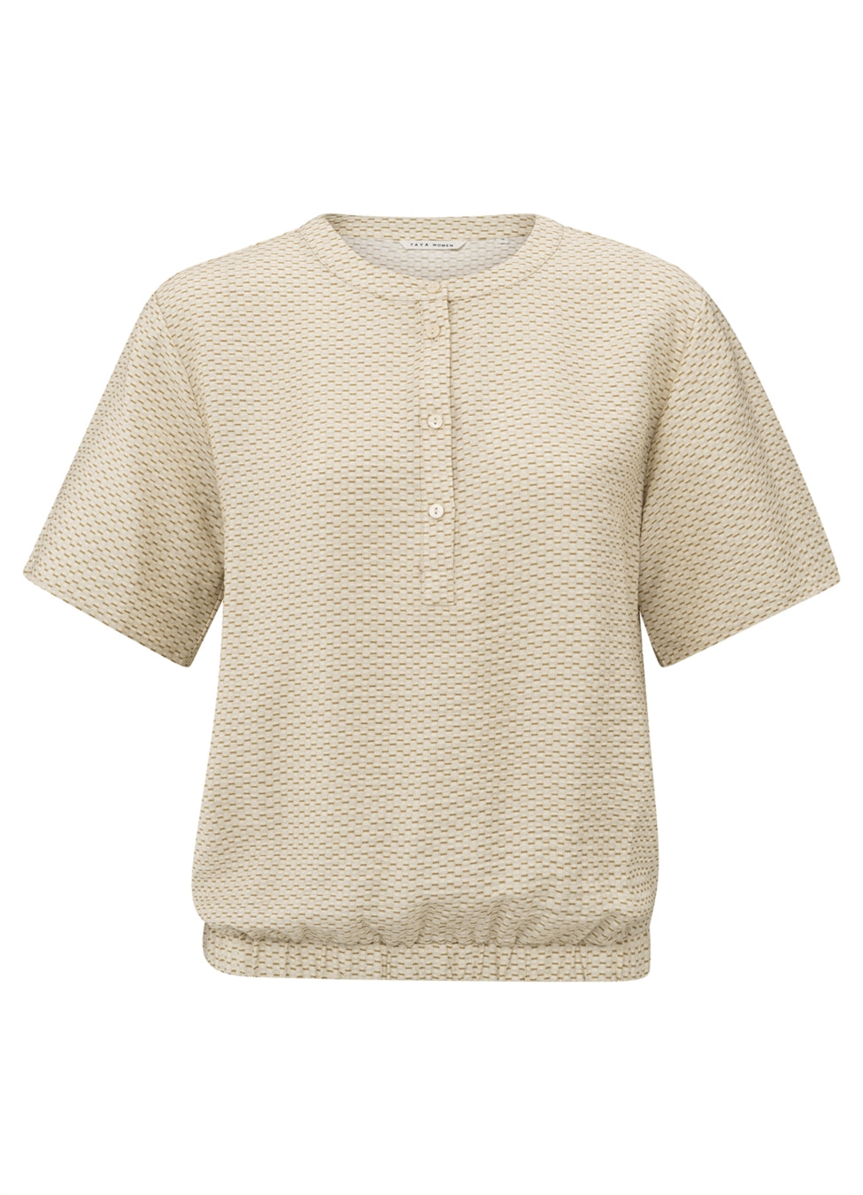 This airy blouse is crafted from a lightweight, woven fabric with a subtle print. Featuring a polo collar with button closure and short sleeves, it combines sporty details with a flattering elasticated waist for a regular fit. Perfect to pair with the matching trousers or your favorite jeans.