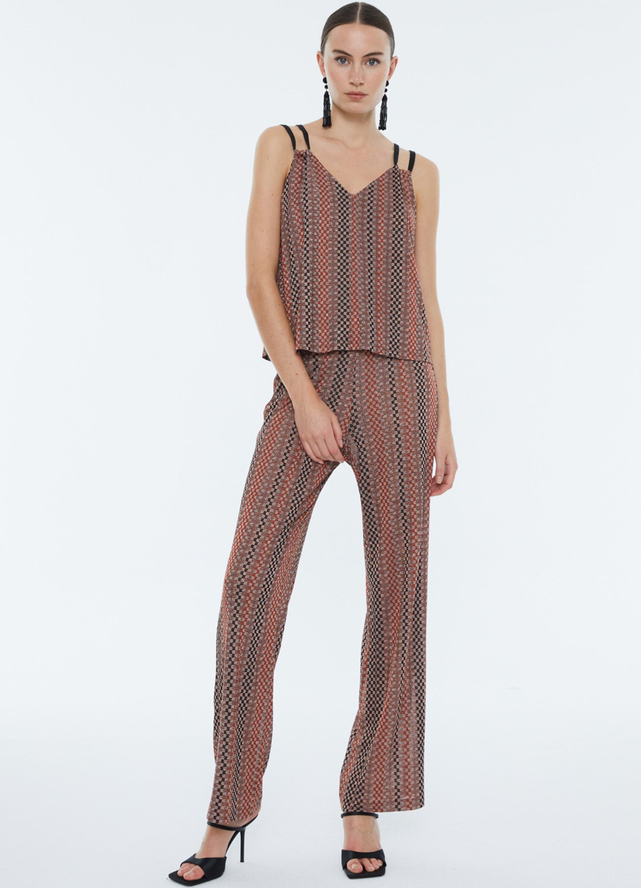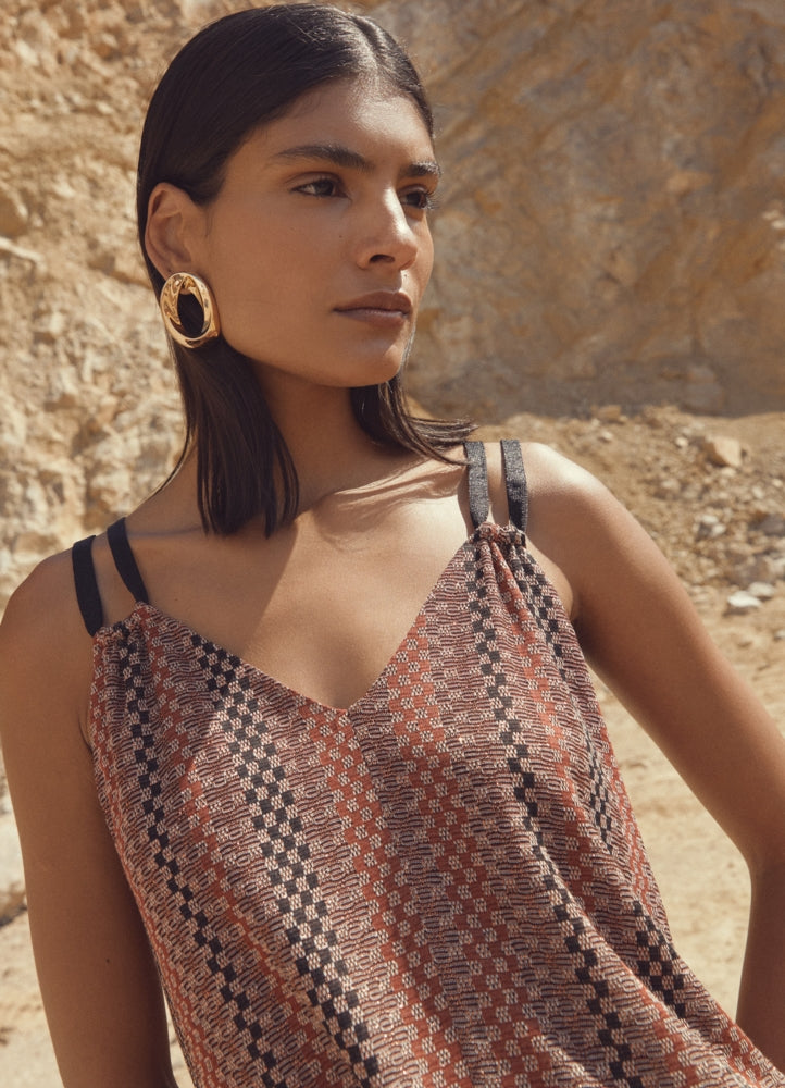 This printed top combines a lightweight feel with a modern design. Featuring a flattering V-neckline, double straps, and a relaxed fit, it offers both comfort and style. The all-over geometric pattern adds a playful yet sophisticated touch. Perfect to wear on its own or paired with the matching trousers for a coordinated look.