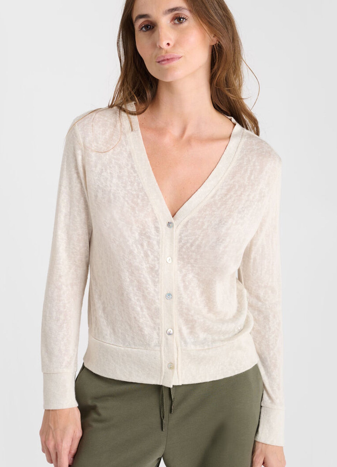 - V-neck for easy layering - Straight cut for a flattering fit - Buttoned closure for versatile styling - Long sleeves with ribbed edges for added detail - Lightweight fabric with a subtle shine