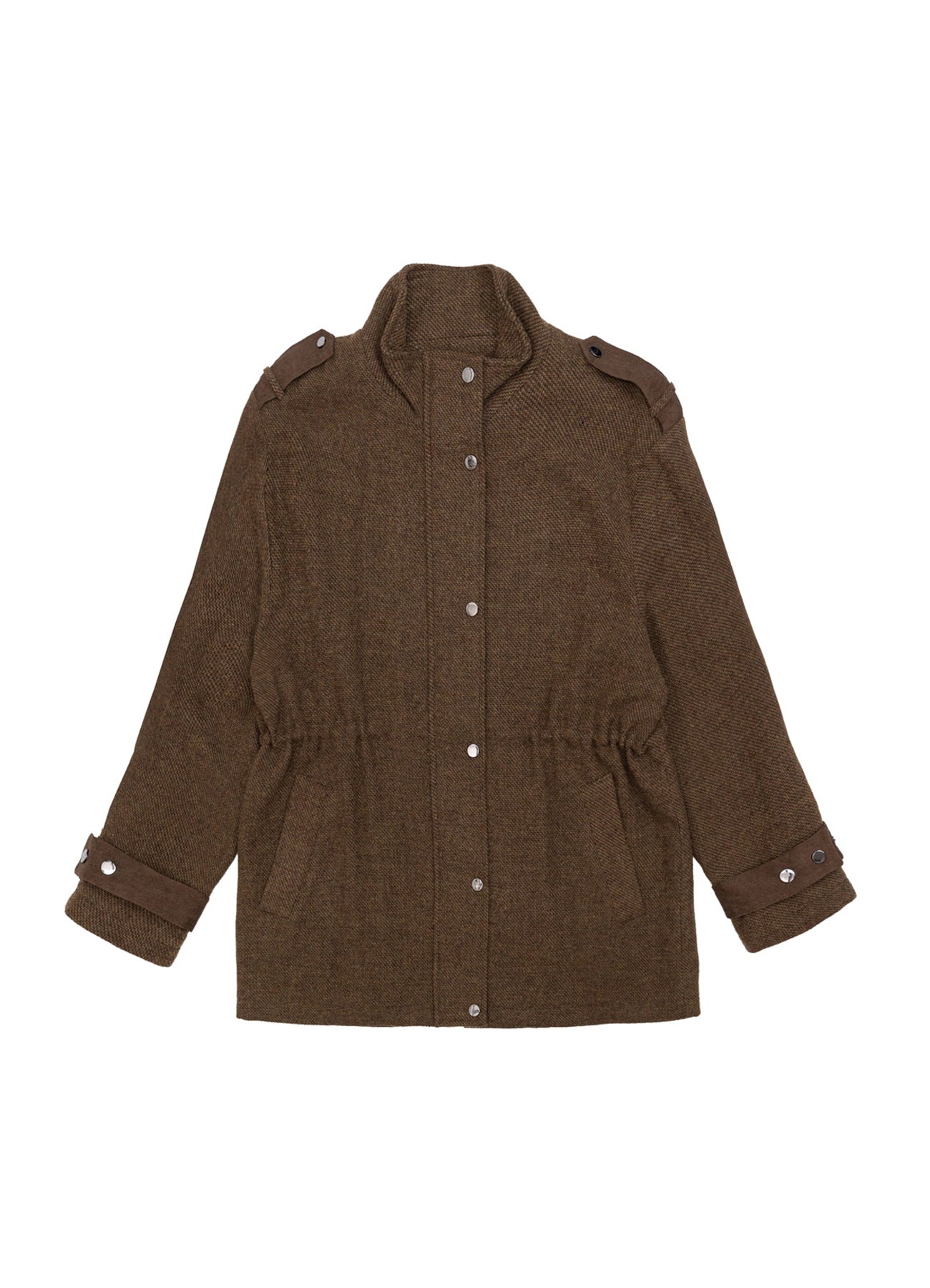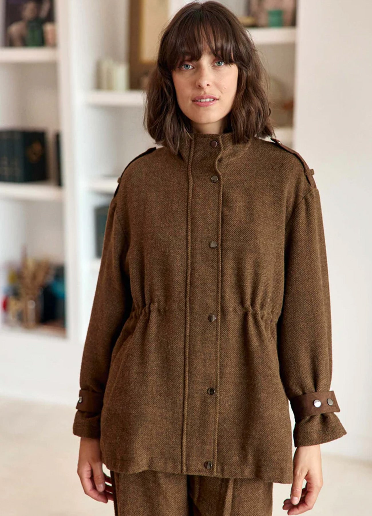 This structured-cut jacket features a refined chevron weave for a polished yet contemporary look. Designed with an officers collar and long sleeves, it offers a clean, tailored silhouette. Adjustable drawstrings at the waist allow for a personalised fit, combining structure with everyday practicality.